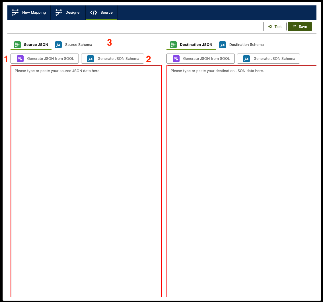 - Follow the same steps for Destination mappings or paste the destination JSON into the Destination JSON field as required.