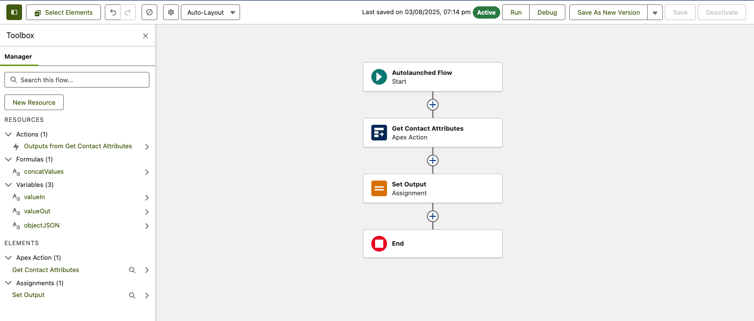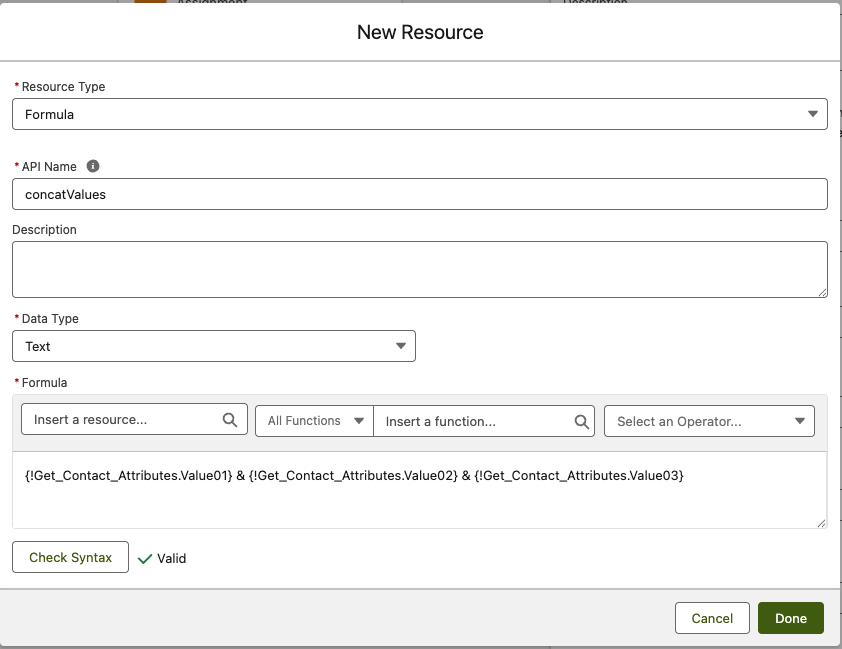 The below is an example Utility-Flow that concatenates the Title, FirstName and LastName from a contact record. For this example, it is assuming a Contact Object is passed. Below a sample Contact record passed from Source: