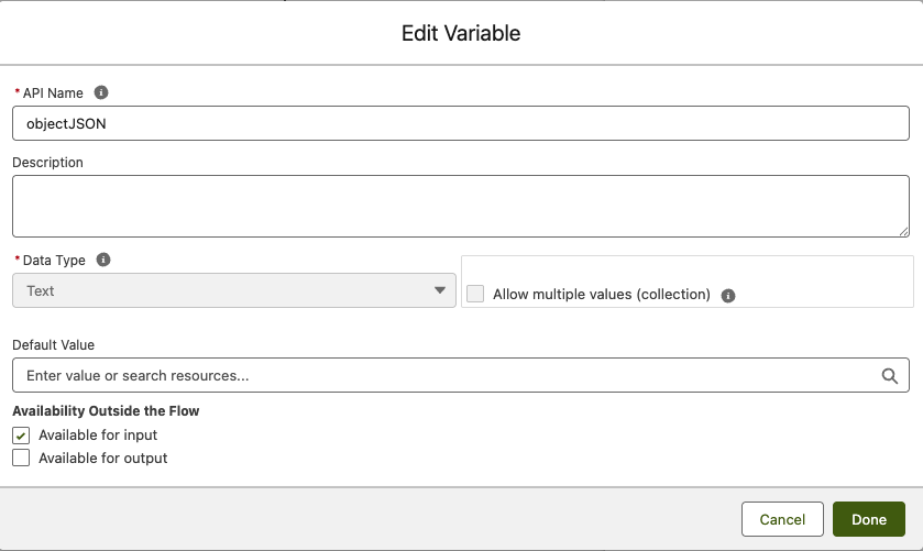 Note: Ensure the valueIn variable is marked as Available for input